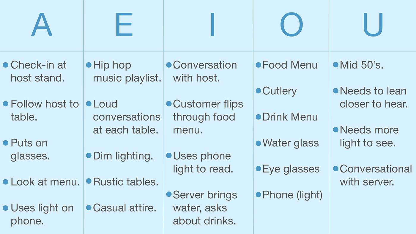 아에이오우를 진행한다면 조사한 데이터를 체계적으로 구조화하고 정보를 모으는데 사용된다. 정성적으로 진행하는 것으로 이는 초기 단계 이후 구체화를 진행할 때 사용된다.
